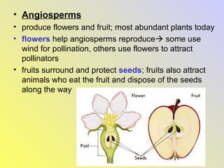 Seeds are found only in flowering plants and gymnosperms. Seeds when compared to spores have distinct advantages due to their hard outer shells and internal structures called endosperms which provide essential nutrients for enclosed seedlings. Most plants produce fruits that are adapted for dispersing seeds.